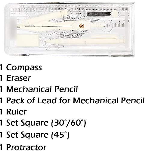 Pakket omvat: 1 Kompas, 1 geval van lood voor mechanisch potlood, 1 mechanisch potlood, 1 liniaal, 1 set vierkant (30 ° / 60 °), 1 set vierkant (45 °), 1 gradenboog, 1 gum.