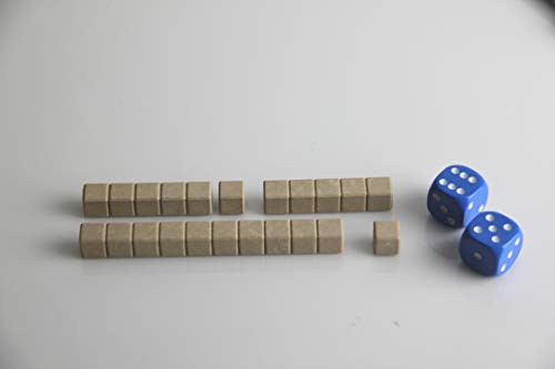 2 Hunderterplatten mit und ohne aufgedruckte Zahlen, 22 Zehnerstäbe, 6 Fünferstäbe und 28 Einerwürfelchen aus RE-Wood, je 2 rote und blaue Würfel, 1 Anleitung.